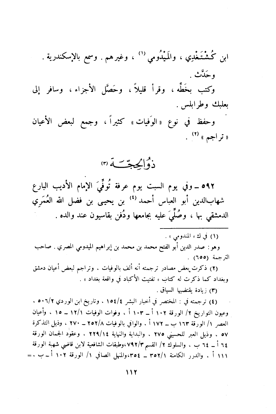 592 - وَفِي يَوْم السبت يَوْم عَرَفَة توفّي الإِمَام الأديب البارع شهَاب الدّين أَبُو الْعَبَّاس احْمَد بن يحيى بن فضل الله الْعمريّ الدِّمَشْقِي بهَا وَصلي عَلَيْهِ بجامعها وَدفن بقاسيون عِنْد وَالِده