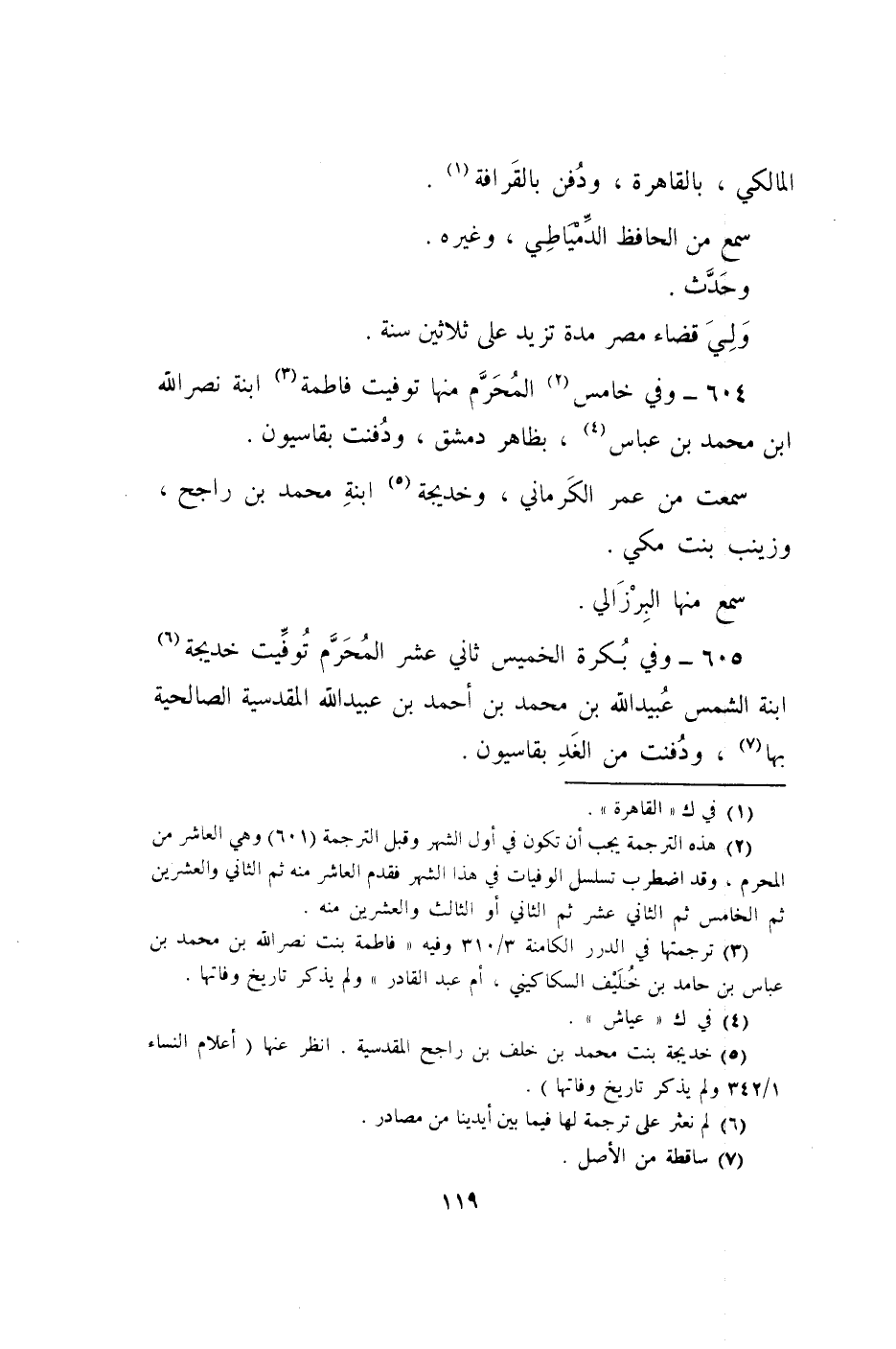 605 - وَفِي بكرَة الْخَمِيس ثَانِي عشر الْمحرم توفيت خَدِيجَة ابْنة الشَّمْس عبيد الله بن مُحَمَّد بن احْمَد بن عبيد الله المقدسية الصالحية بهَا ودفنت من الْغَد بقاسيون سَمِعت من ابْن البُخَارِيّ