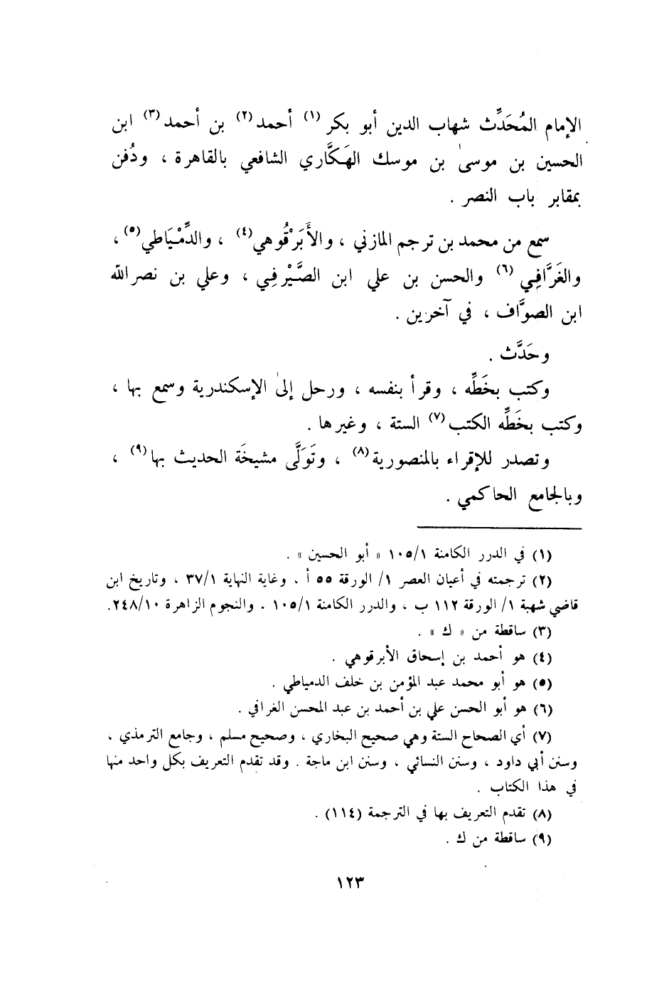 الإِمَام الْمُحدث شهَاب الدّين أَبُو بكر احْمَد بن أَحْمد ابْن الْحُسَيْن بن مُوسَى بن موسك الهكاري الشَّافِعِي بِالْقَاهِرَةِ وَدفن بمقابر بَاب النَّصْر