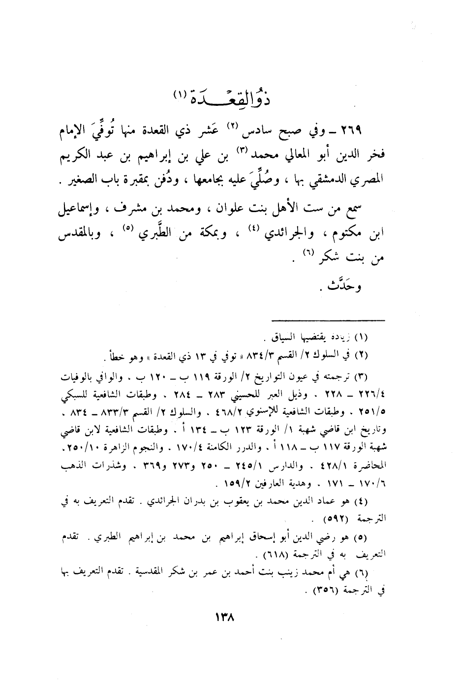 269 - وَفِي صبح سادس عشر ذِي الْقعدَة مِنْهَا توفّي الإِمَام فَخر الدّين أَبُو الْمَعَالِي مُحَمَّد بن عَليّ بن إِبْرَاهِيم بن عبد الْكَرِيم الْمصْرِيّ الدِّمَشْقِي بهَا وَصلي عَلَيْهِ بجامعها وَدفن بمقبرة بَاب الصَّغِير