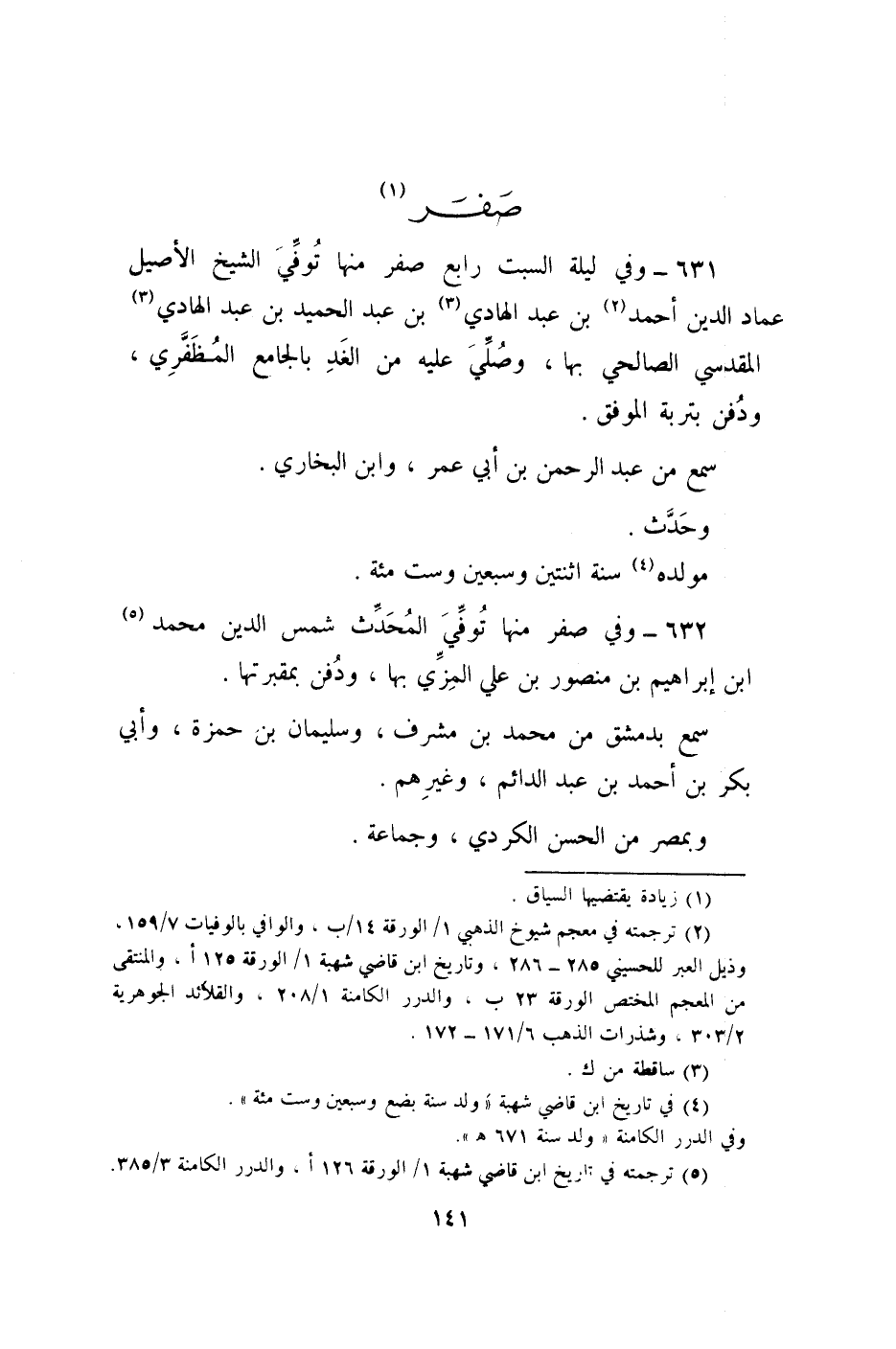 631 - وَفِي لَيْلَة السبت رَابِع صفر مِنْهَا توفّي الشَّيْخ الْأَصِيل عماد الدّين أَحْمد بن عبد الْهَادِي بن عبد الحميد بن عبد الْهَادِي الْمَقْدِسِي الصَّالِحِي بهَا وَصلي عَلَيْهِ من الْغَد بالجامع المظفري وَدفن بتربة الْمُوفق