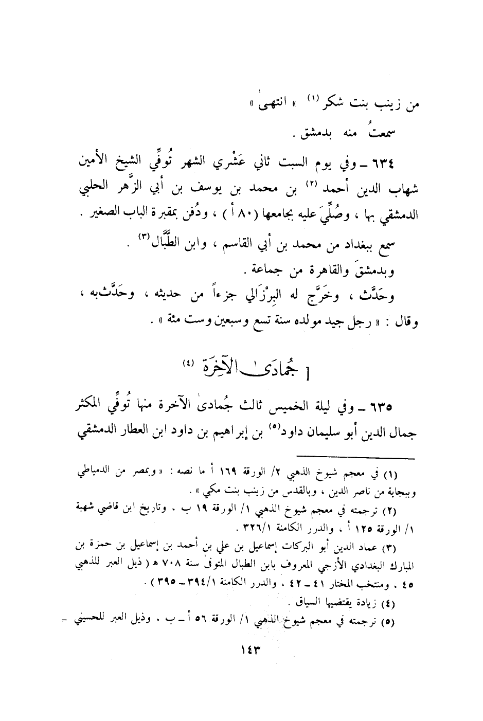 635 - وَفِي لَيْلَة الْخَمِيس ثَالِث جُمَادَى الْآخِرَة مِنْهَا توفّي المكثر جمال الدّين أَبُو سُلَيْمَان دَاوُد بن إِبْرَاهِيم بن دَاوُد ابْن الْعَطَّار الدِّمَشْقِي