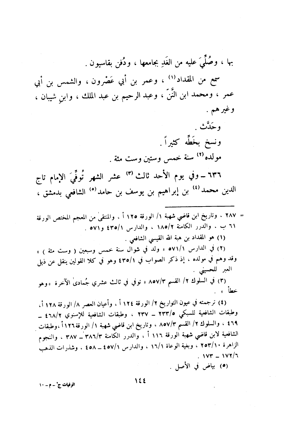 636 - وَفِي يَوْم الْأَحَد ثَالِث عشر الشَّهْر توفّي الإِمَام تَاج الدّين مُحَمَّد بن إِبْرَاهِيم بن يُوسُف بن حَامِد الشَّافِعِي بِدِمَشْق