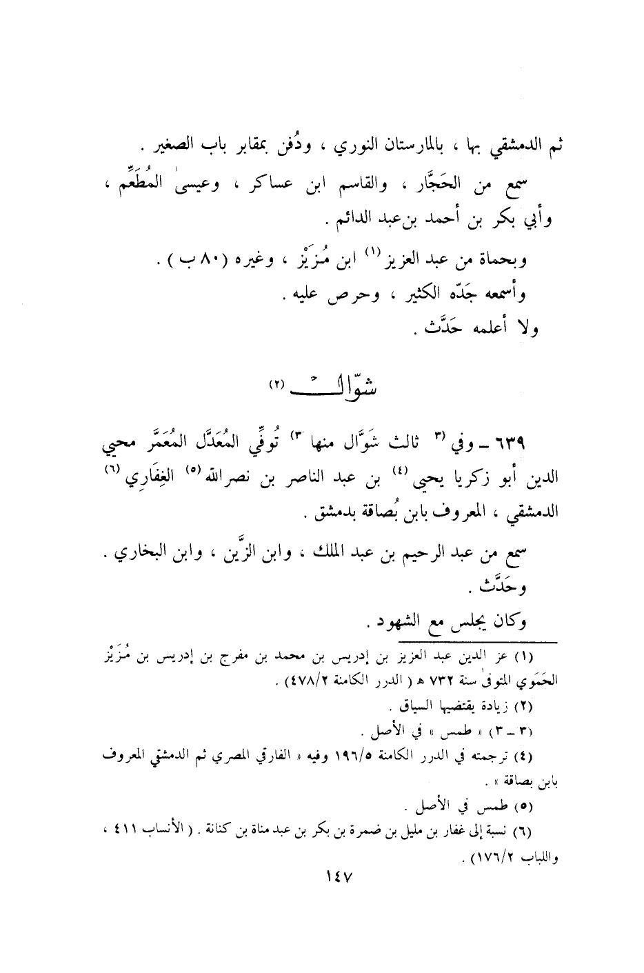 639 - وَفِي ثَالِث شَوَّال مِنْهَا توفّي الْمعدل المعمر محيي الدّين أَبُو زَكَرِيَّا يحيى بن عبد النَّاصِر بن نصر الله الْغِفَارِيّ الدِّمَشْقِي الْمَعْرُوف بِابْن بصاقة بِدِمَشْق
