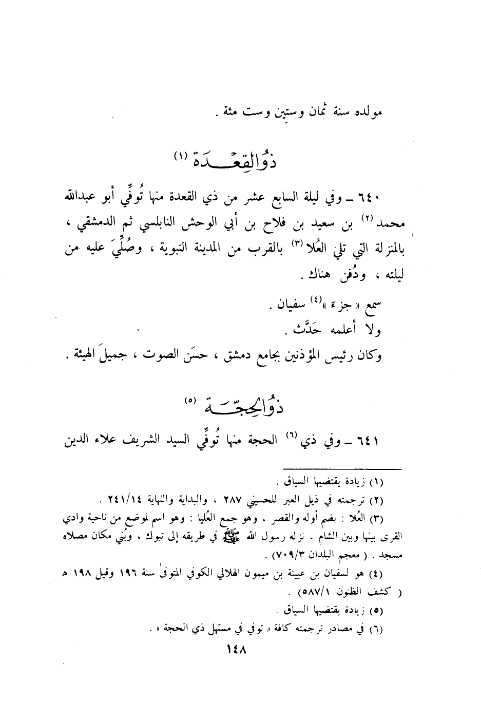 640 - وَفِي لَيْلَة السَّابِع عشر من ذِي الْقعدَة مِنْهَا توفّي أَبُو عبد الله مُحَمَّد بن سعيد بن فلاح بن أبي الْوَحْش النابلسي ثمَّ الدِّمَشْقِي بالمنزلة الَّتِي تلِي الْعلَا بِالْقربِ من الْمَدِينَة النَّبَوِيَّة وَصلي عَلَيْهِ من ليلته وَدفن هُنَاكَ