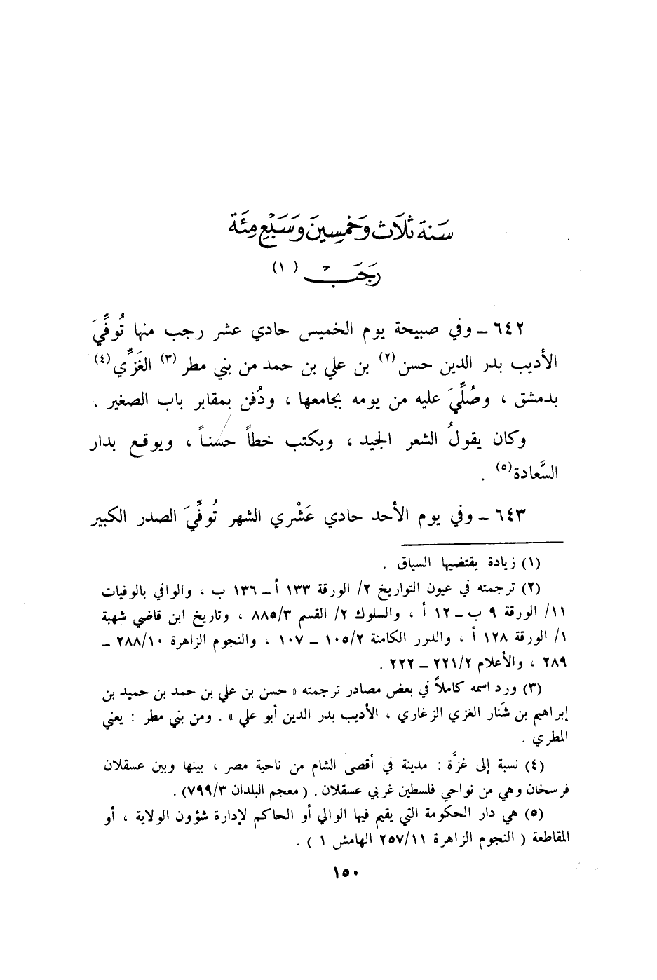 642 - وَفِي صَبِيحَة يَوْم الْخَمِيس حادي عشر رَجَب مِنْهَا توفّي الأديب بدر الدّين حسن بن عَليّ بن حمد من بني مطر الْغَزِّي بِدِمَشْق وَصلي عَلَيْهِ من يَوْمه بجامعها وَدفن بمقابر بَاب الصَّغِير