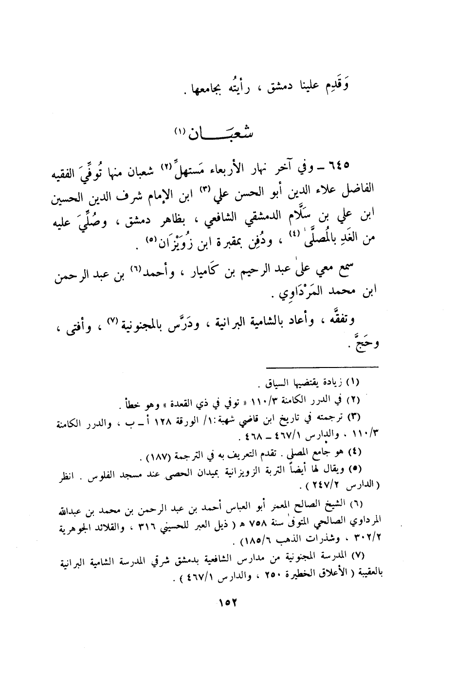 645 - وَفِي آخر نَهَار الْأَرْبَعَاء مستهل شعْبَان مِنْهَا توفّي الْفَقِيه الْفَاضِل عَلَاء الدّين أَبُو الْحسن عَليّ ابْن الإِمَام شرف الدّين الْحُسَيْن بن عَليّ بن سَلام الدِّمَشْقِي الشَّافِعِي بِظَاهِر دمشق وَصلي عَلَيْهِ من الْغَد بالمصلى وَدفن بمقبرة ابْن زويزان