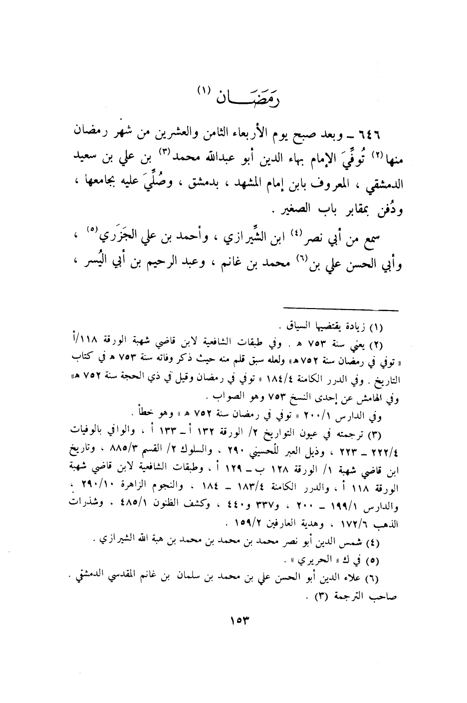 646 - وَبعد صبح يَوْم الْأَرْبَعَاء الثَّامِن وَالْعِشْرين من شهر رَمَضَان مِنْهَا توفّي الإِمَام بهاء الدّين أَبُو عبد الله مُحَمَّد بن عَليّ بن سعيد الدِّمَشْقِي الْمَعْرُوف بِابْن إِمَام المشهد بِدِمَشْق وَصلي عَلَيْهِ بجامعها وَدفن بمقابر بَاب الصَّغِير
