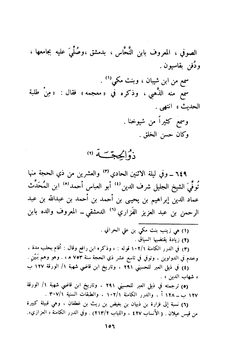 3 - 649 وَفِي لَيْلَة الِاثْنَيْنِ الْحَادِي وَالْعِشْرين من ذِي الْحجَّة مِنْهَا توفّي الشَّيْخ الْجَلِيل شرف الدّين أَبُو الْعَبَّاس أَحْمد ابْن الْمُحدث عماد الدّين إِبْرَاهِيم بن يحيى بن أَحْمد بن أَحْمد بن عبد الله بن عبد الرَّحْمَن بن عبد الْعَزِيز الْفَزارِيّ الدِّمَشْقِي الْمَعْرُوف وَالِده بِابْن