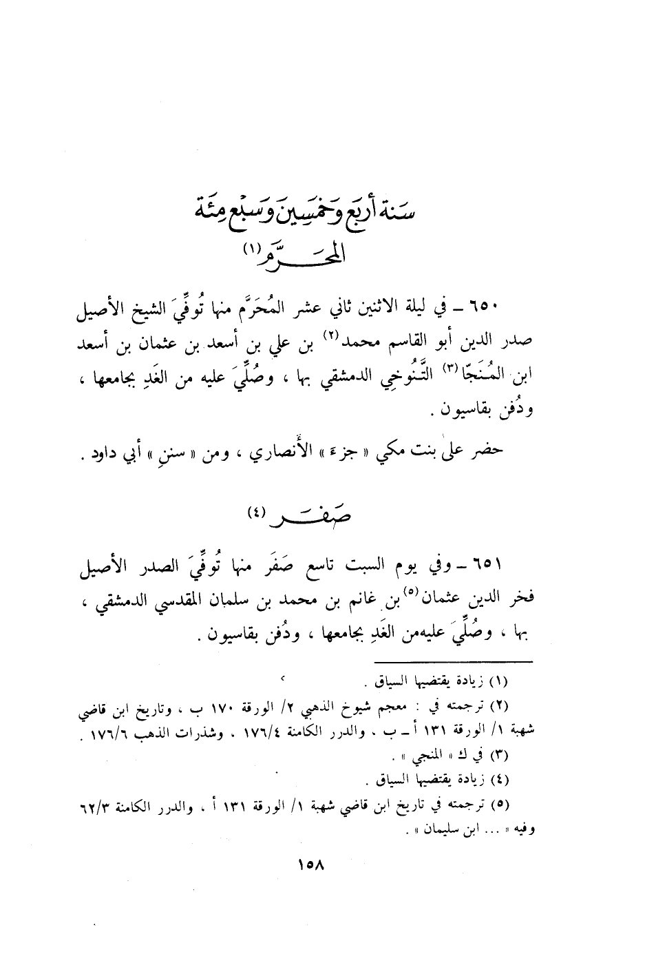650 - فِي لَيْلَة الِاثْنَيْنِ ثَانِي عشر الْمحرم مِنْهَا توفّي الشَّيْخ الْأَصِيل صدر الدّين ابو الْقَاسِم مُحَمَّد بن عَليّ بن أسعد بن عُثْمَان بن اِسْعَدْ ابْن المنجا التنوخي الدِّمَشْقِي بهَا وَصلي عَلَيْهِ من الْغَد بجامعها وَدفن بقاسيون
