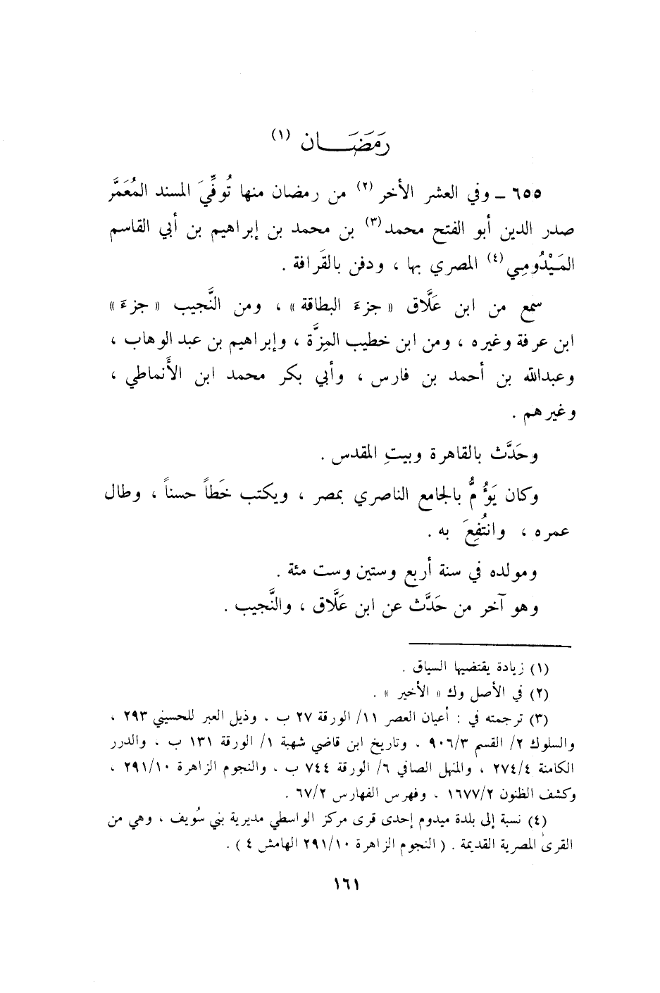 655 - وَفِي الْعشْر الْأُخَر من رَمَضَان مِنْهَا توفّي الْمسند المعمر صدر الدّين أَبُو الْفَتْح مُحَمَّد بن مُحَمَّد بن إِبْرَاهِيم بن أبي الْقَاسِم الْمَيْدُومِيُّ الْمصْرِيّ بهَا وَدفن بالقرافة