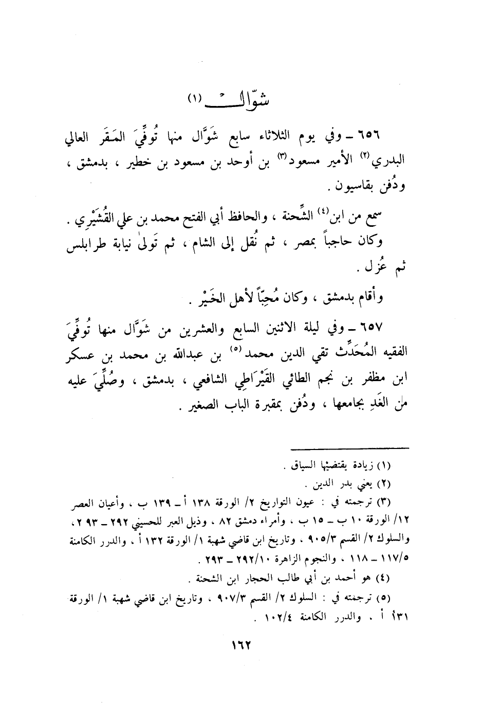 656 - وَفِي يَوْم الثُّلَاثَاء سَابِع شَوَّال مِنْهَا توفّي الْمقر العالي البدري الْأَمِير مَسْعُود بن أوحد بن مَسْعُود بن خطير بِدِمَشْق وَدفن بقاسيون