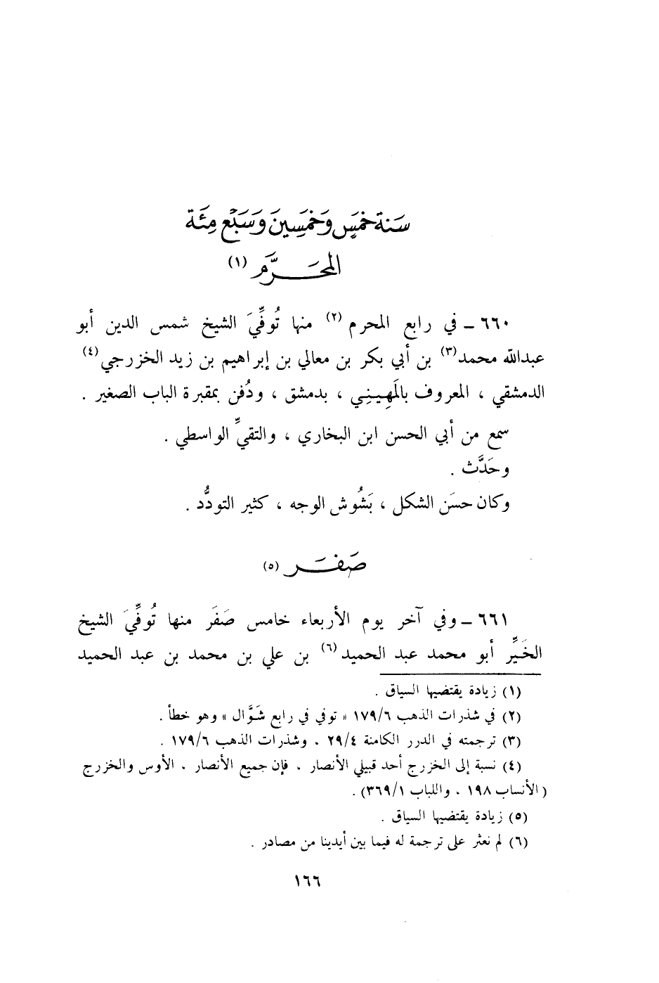 661 - وَفِي آخر يَوْم الْأَرْبَعَاء خَامِس صفر مِنْهَا توفّي الشَّيْخ الْخَيْر أَبُو مُحَمَّد عبد الحميد بن عَليّ بن مُحَمَّد بن عبد الحميد