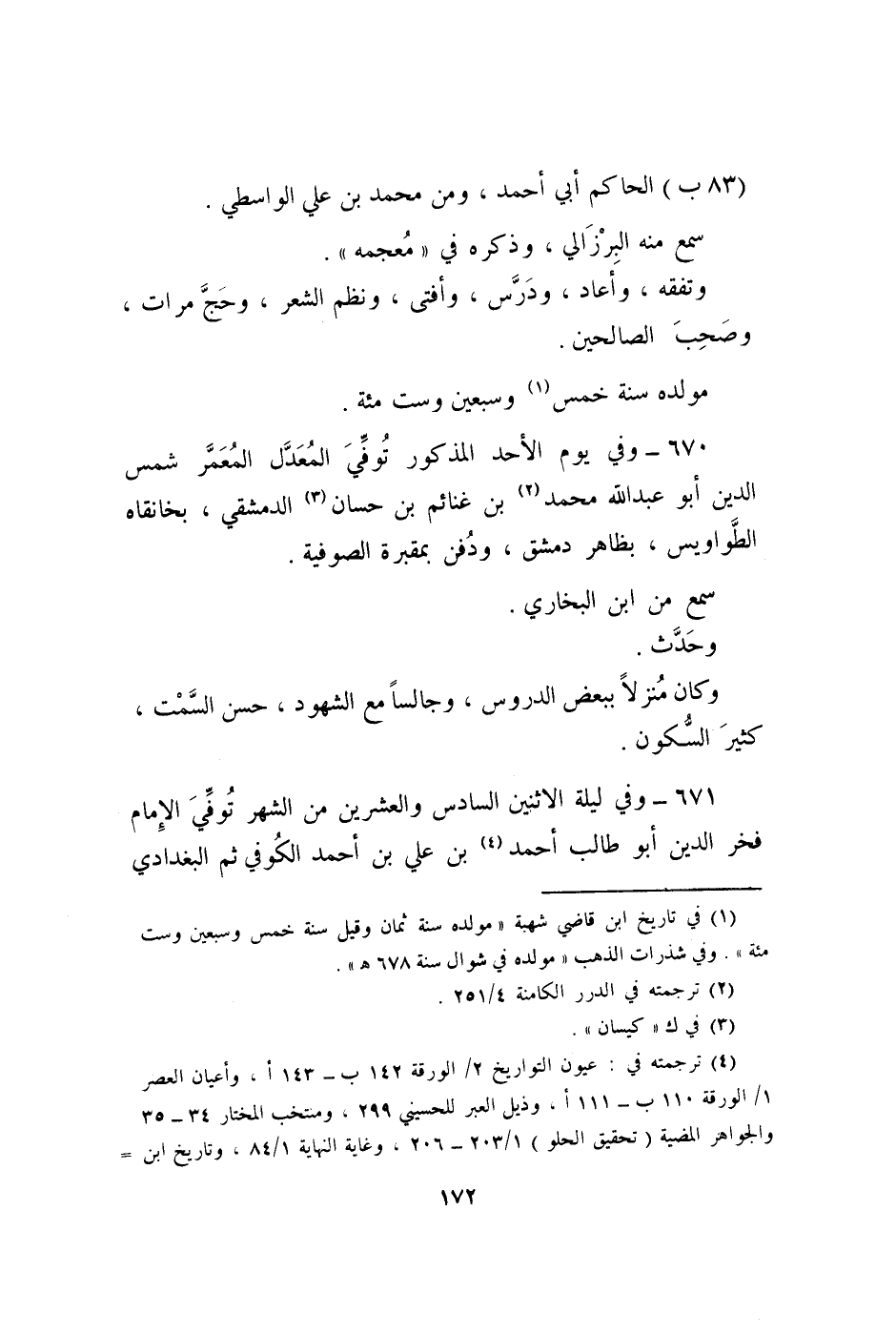 670 - وَفِي يَوْم الْأَحَد الْمَذْكُور توفّي الْمعدل المعمر شمس الدّين ابو عبد الله مُحَمَّد بن غَنَائِم بن حسان الدِّمَشْقِي بخانقاه الطواويس بِظَاهِر دمشق وَدفن بمقبرة الصُّوفِيَّة