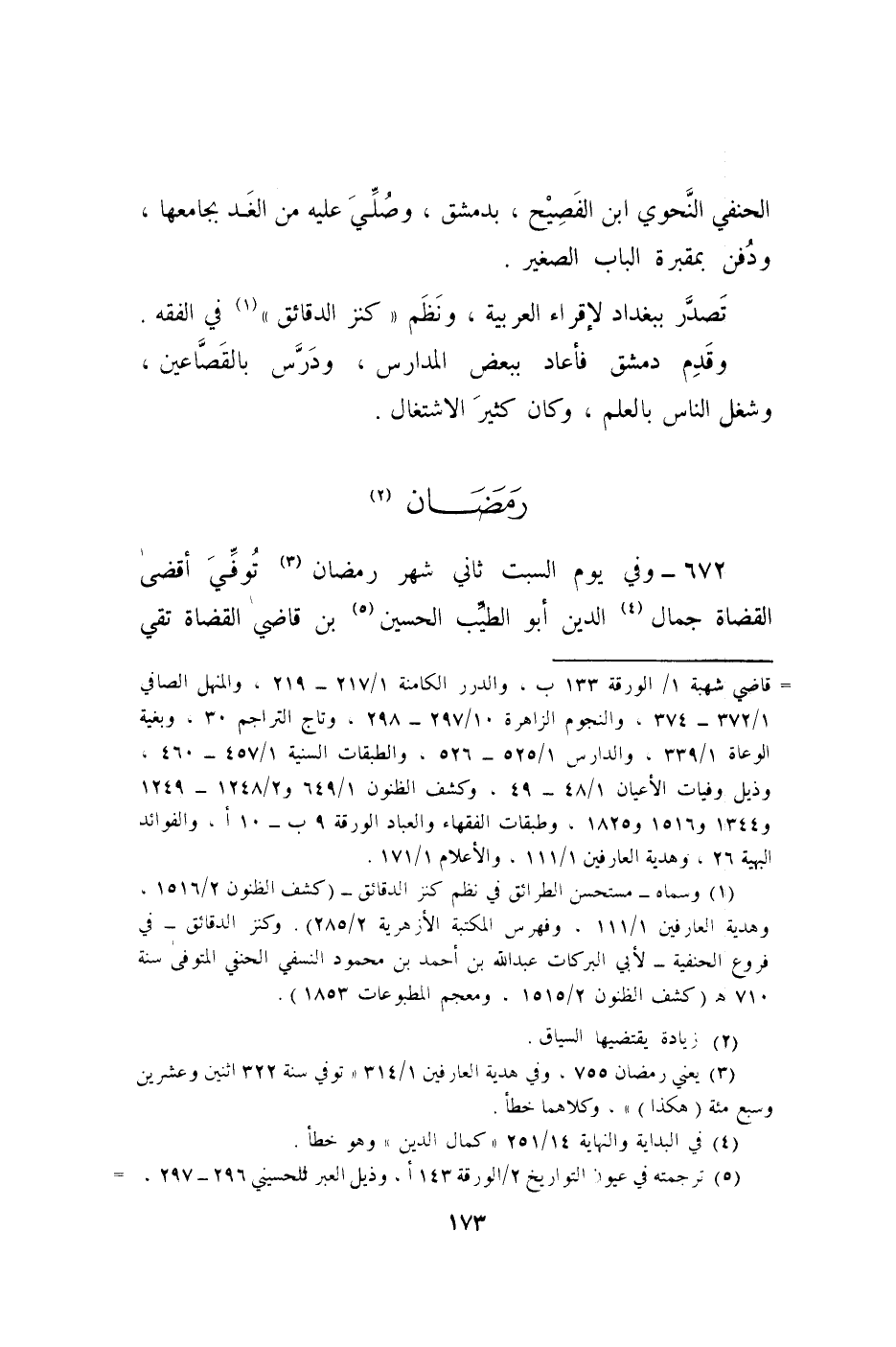 672 - وَفِي يَوْم السبت ثَانِي شهر رَمَضَان توفّي أقضى الْقُضَاة جمال الدّين أَبُو الطّيب الْحُسَيْن بن قَاضِي الْقُضَاة تَقِيّ
