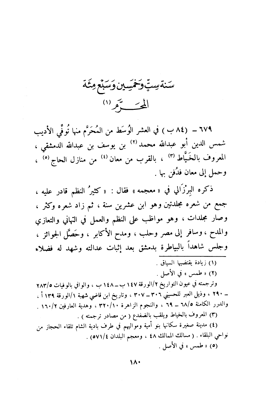 679 - (84 ب) فِي الْعشْر الْوسط من الْمحرم مِنْهَا توفّي الأديب شمس الدّين أَبُو عبد الله مُحَمَّد بن يُوسُف بن عبد الله الدِّمَشْقِي الْمَعْرُوف بالخياط بِالْقربِ من معَان من منَازِل الْحَاج وَحمل إِلَى معَان فَدفن بهَا