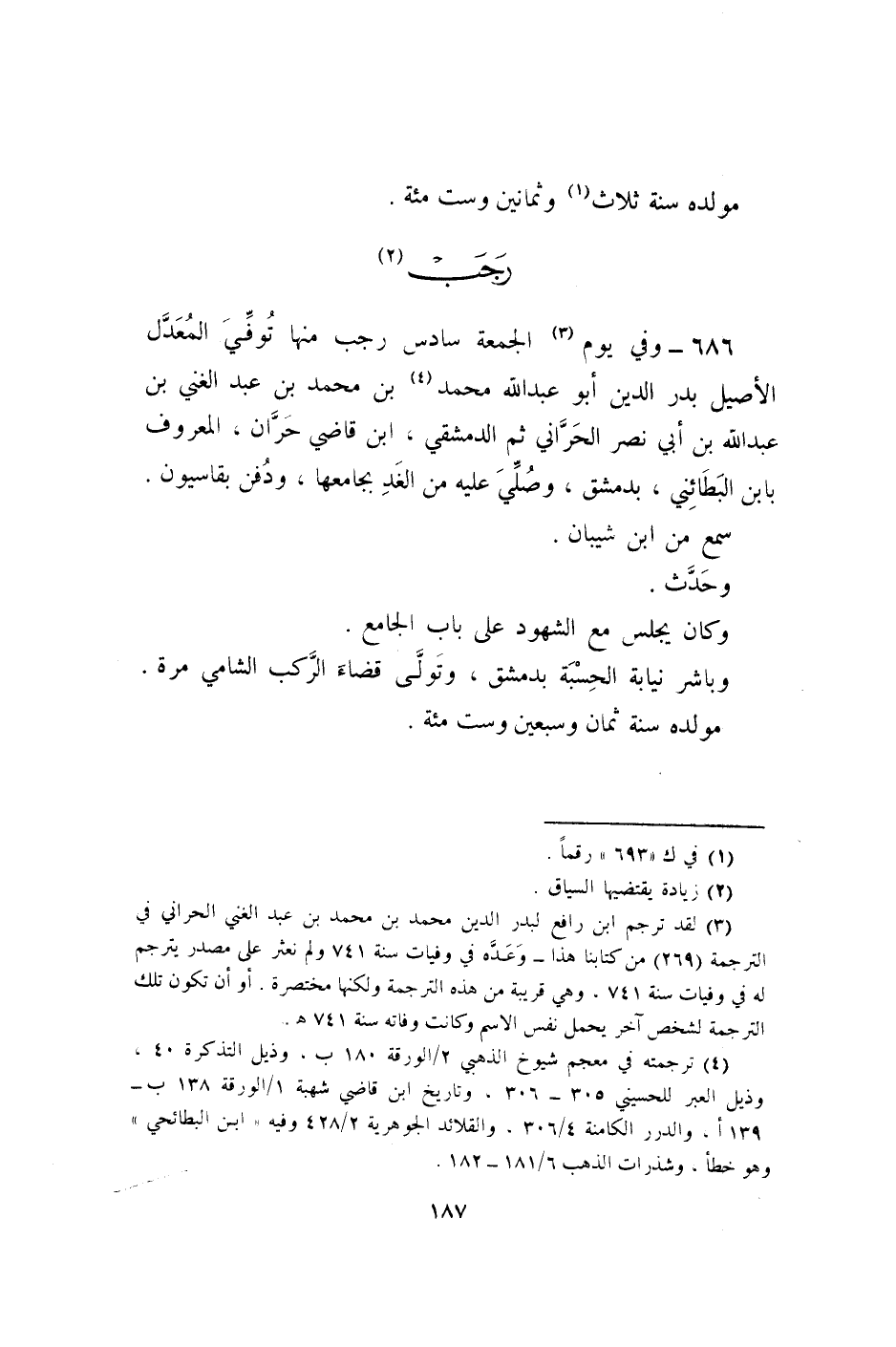 686 - وَفِي يَوْم الْجُمُعَة سادس رَجَب مِنْهَا توفّي الْمعدل الْأَصِيل بدر الدّين أَبُو عبد الله مُحَمَّد بن مُحَمَّد بن عبد الْغَنِيّ بن عبد الله بن أبي النَّصْر الْحَرَّانِي ثمَّ الدِّمَشْقِي ابْن قَاضِي حران الْمَعْرُوف بِابْن البطائني بِدِمَشْق وَصلي عَلَيْهِ من الْغَد بجامعها وَدفن بقاسيون