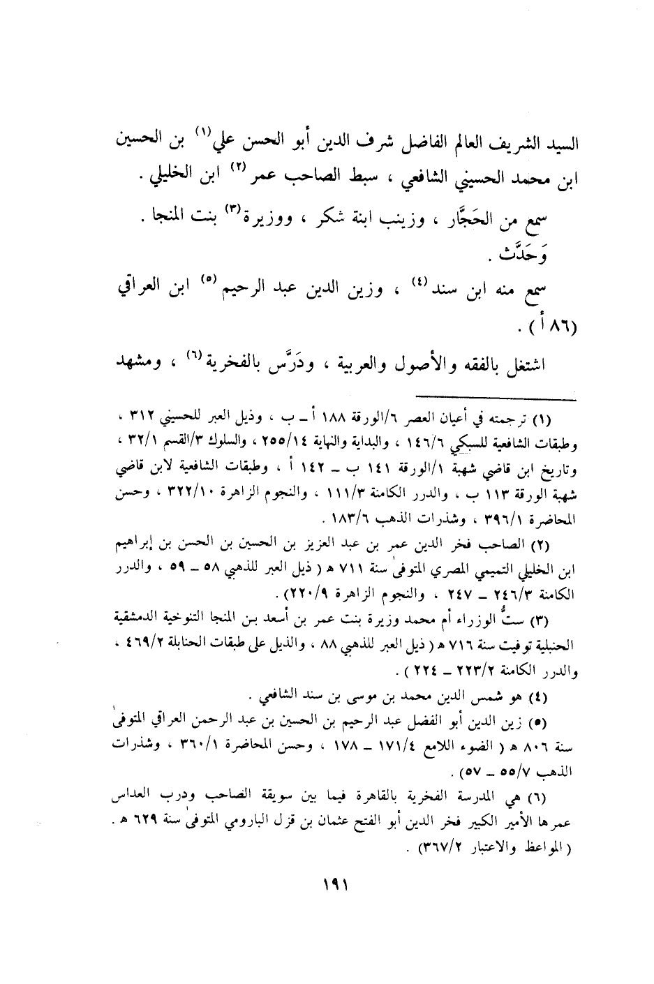 السَّيِّد الشريف الْعَالم الْفَاضِل شرف الدّين أَبُو الْحسن عَليّ بن الْحُسَيْن ابْن مُحَمَّد الْحُسَيْنِي الشَّافِعِي سبط الصاحب عمر ابْن الخليلي سمع من الحجار وَزَيْنَب ابْنة شكر ووزيرة بنت المنجا