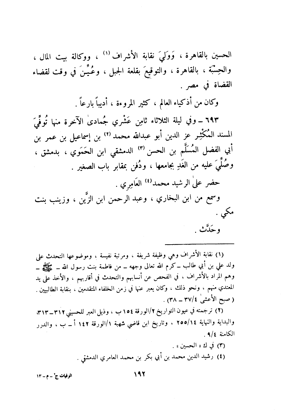 693 - وَفِي لَيْلَة الثُّلَاثَاء ثامن عشري جُمَادَى الْآخِرَة مِنْهَا توفّي الْمسند المكثر عز الدّين أَبُو عبد الله مُحَمَّد بن إِسْمَاعِيل بن عمر بن أبي الْفضل الْمُسلم بن الْحسن الدِّمَشْقِي ابْن الْحَمَوِيّ بِدِمَشْق وَصلي عَلَيْهِ من الْغَد بجامعها وَدفن بمقابر بَاب الصَّغِير