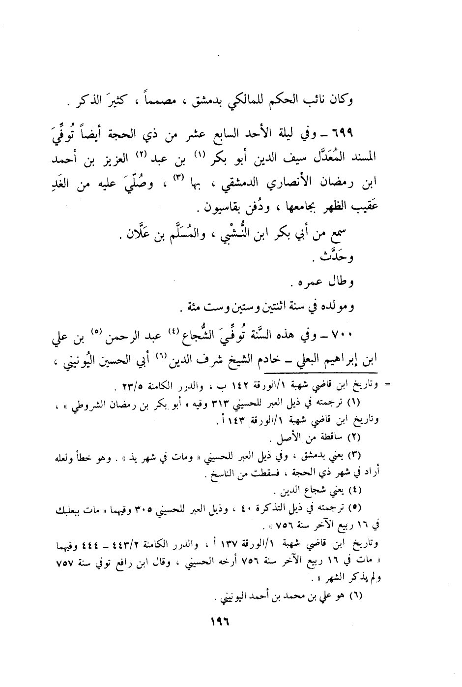 700 - وَفِي هَذِه السّنة توفّي الشجاع عبد الرَّحْمَن بن عَليّ ابْن إِبْرَاهِيم البعلي خَادِم الشَّيْخ شرف الدّين أبي الْحُسَيْن اليونيني
