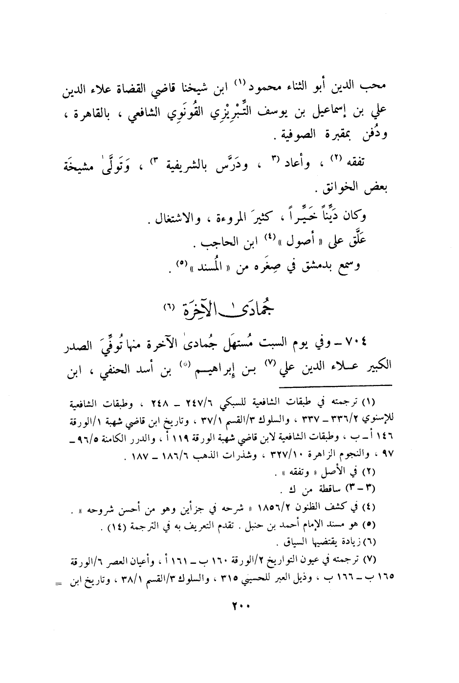 704 - وَفِي يَوْم السبت مستهل جُمَادَى الْآخِرَة مِنْهَا توفّي الصَّدْر الْكَبِير عَلَاء الدّين عَليّ بن إِبْرَاهِيم بن أَسد الْحَنَفِيّ ابْن