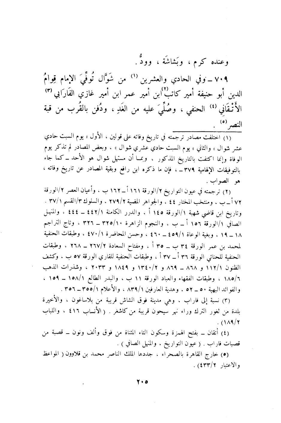 709 - وَفِي الْحَادِي وَالْعِشْرين من شَوَّال توفّي الإِمَام قوام الدّين أَبُو حنيفَة أَمِير كَاتب ابْن أَمِير عمر ابْن أَمِير غَازِي الفارابي الْأَتْقَانِيّ الْحَنَفِيّ وَصلي عَلَيْهِ من الْغَد وَدفن بِالْقربِ من قبَّة النَّصْر
