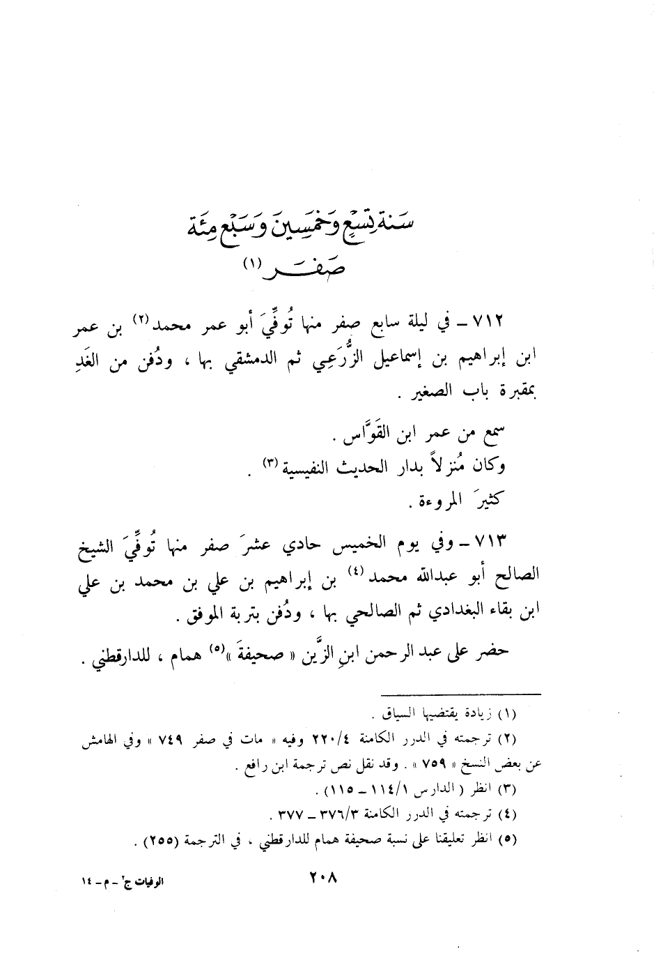712 - فِي لَيْلَة سَابِع صفر مِنْهَا توفّي أَبُو عمر مُحَمَّد بن عمر بن إِبْرَاهِيم بن إِسْمَاعِيل الزرعي ثمَّ الدِّمَشْقِي بهَا وَدفن من الْغَد بمقبرة بَاب الصَّغِير
