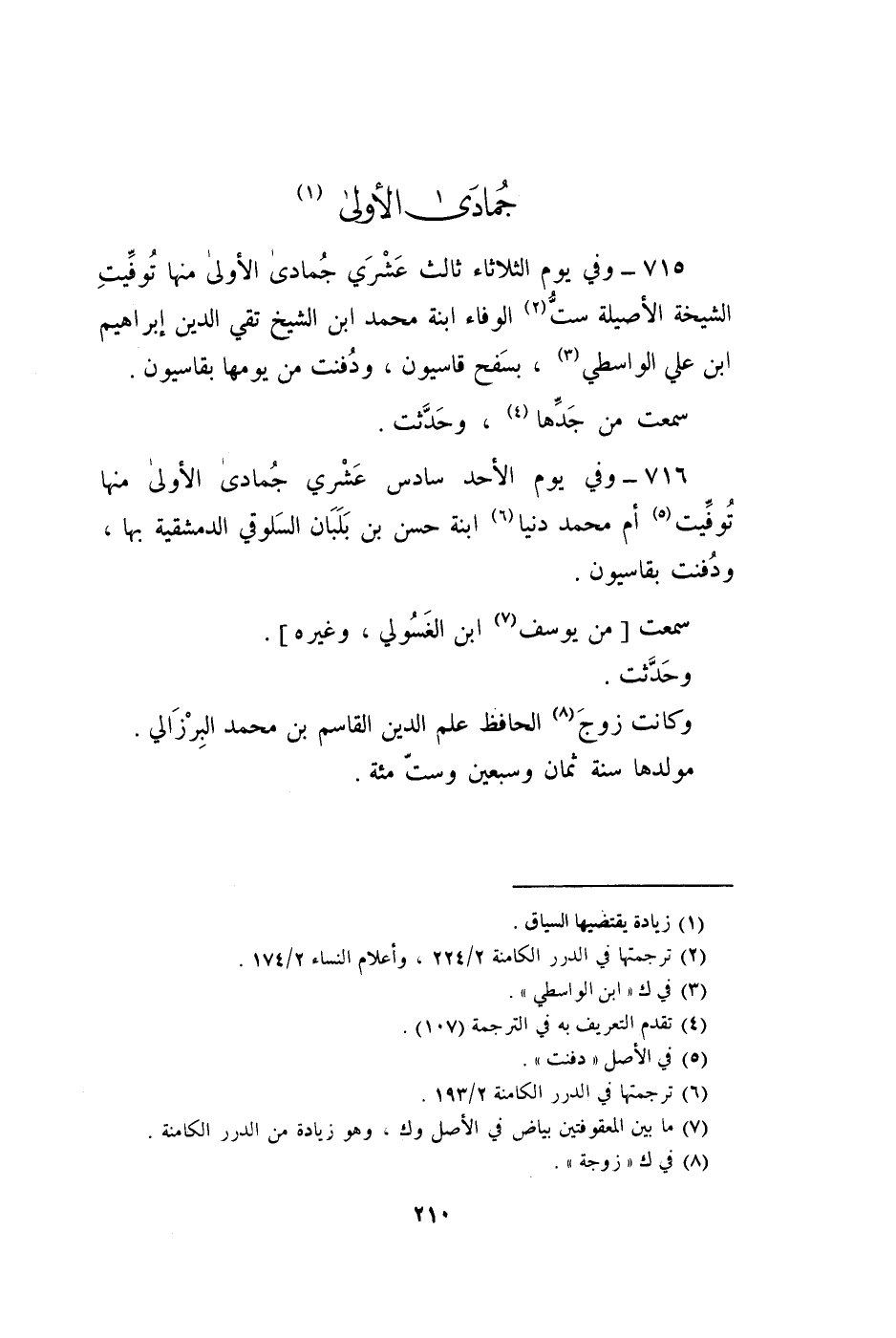715 - وَفِي يَوْم الثُّلَاثَاء ثَالِث عشري جُمَادَى الأولى مِنْهَا توفيت الشيخة الأصيلة سِتّ الْوَفَاء ابْنة مُحَمَّد ابْن الشَّيْخ تَقِيّ الدّين إِبْرَاهِيم بن عَليّ الوَاسِطِيّ بسفح قاسيون ودفنت من يَوْمهَا بقاسيون