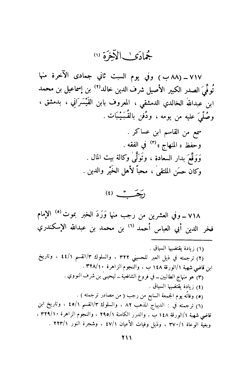 717 - (88 ب) وَفِي يَوْم السبت ثَانِي جُمَادَى الْآخِرَة مِنْهَا توفّي الصَّدْر الْكَبِير الْأَصِيل شرف الدّين خَالِد بن إِسْمَاعِيل بن مُحَمَّد بن عبد الله الخالدي الدِّمَشْقِي الْمَعْرُوف بِابْن القيسراني بِدِمَشْق وَصلي عَلَيْهِ من يَوْمه وَدفن بالقبيبات