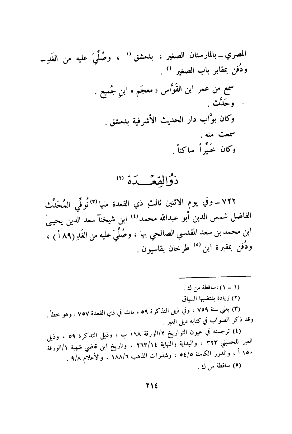 722 - وَفِي يَوْم الِاثْنَيْنِ ثَالِث ذِي الْقعدَة مِنْهَا توفّي الْمُحدث الْفَاضِل شمس الدّين أَبُو عبد الله مُحَمَّد ابْن شَيخنَا سعد الدّين يحيى بن مُحَمَّد بن سعد الْمَقْدِسِي الصَّالِحِي بهَا وَصلي عَلَيْهِ من الْغَد (89 أ) وَدفن بمقبرة ابْن طرخان بقاسيون