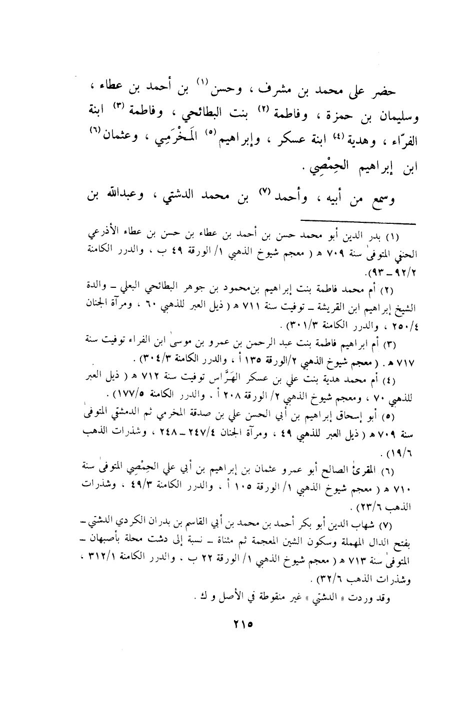 حضر على مُحَمَّد بن مشرف وَحسن بن أَحْمد بن عَطاء وَسليمَان بن حَمْزَة وَفَاطِمَة بنت البطائحي وَفَاطِمَة ابْنة الْفراء وهدية ابْنة عَسْكَر وَإِبْرَاهِيم المخرمي وَعُثْمَان بن إِبْرَاهِيم الْحِمصِي