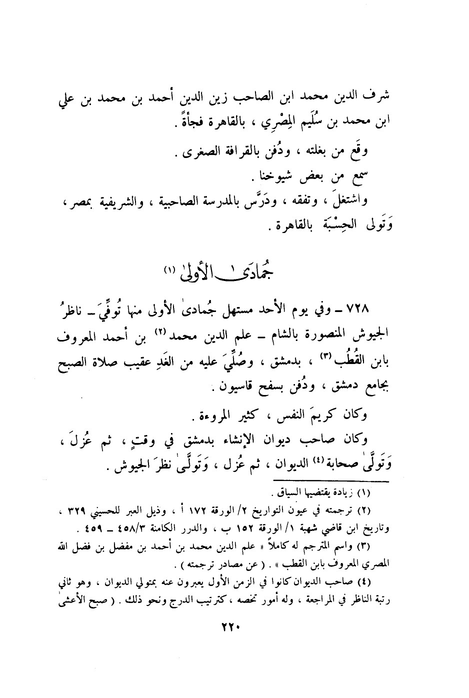 728 - وَفِي يَوْم الْأَحَد مستهل جُمَادَى الأولى مِنْهَا توفّي نَاظر الجيوش المنصورة بِالشَّام علم الدّين مُحَمَّد بن أَحْمد الْمَعْرُوف بِابْن القطب بِدِمَشْق وَصلي عَلَيْهِ من الْغَد عقيب صَلَاة الصُّبْح بِجَامِع دمشق وَدفن بسفح قاسيون
