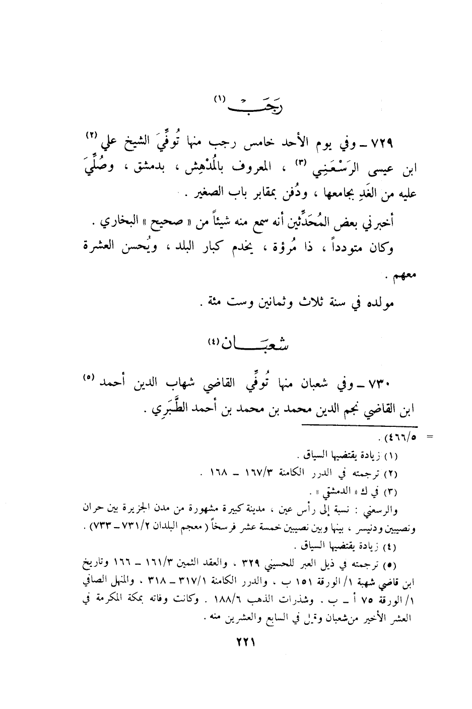 730 - وَفِي شعْبَان مِنْهَا توفّي القَاضِي شهَاب الدّين أَحْمد بن القَاضِي نجم الدّين مُحَمَّد بن مُحَمَّد بن أَحْمد الطَّبَرِيّ