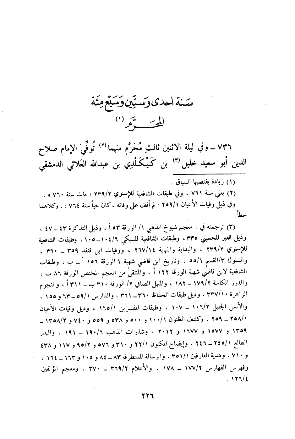 736 - وَفِي لَيْلَة الِاثْنَيْنِ ثَالِث محرم مِنْهُمَا توفّي الإِمَام صَلَاح الدّين أَبُو سعيد خَلِيل بن كيكلدي بن عبد الله العلائي الدِّمَشْقِي