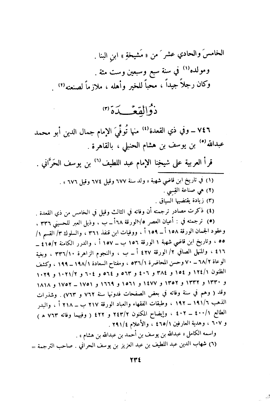 746 - وَفِي ذِي الْقعدَة مِنْهَا توفّي الإِمَام جمال الدّين أَبُو مُحَمَّد عبد الله بن يُوسُف بن هِشَام الْحَنْبَلِيّ بِالْقَاهِرَةِ