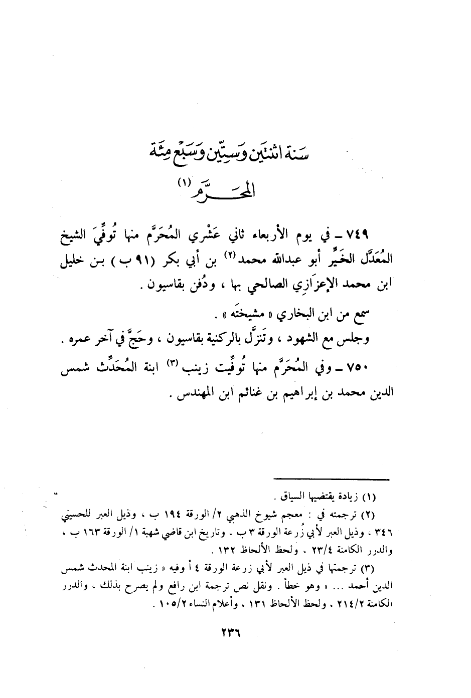749 - فِي يَوْم الْأَرْبَعَاء ثَانِي عشري الْمحرم مِنْهَا توفّي الشَّيْخ الْمعدل الْخَيْر أَبُو عبد الله مُحَمَّد بن أبي بكر (91 ب) بن خَلِيل بن مُحَمَّد الإعزازي الصَّالِحِي بهَا وَدفن بقاسيون