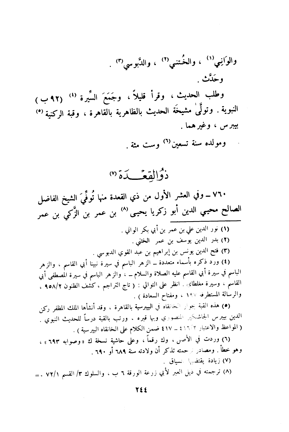 760 - وَفِي الْعشْر الأول من ذِي الْقعدَة مِنْهَا توفّي الشَّيْخ الْفَاضِل الصَّالح محيي الدّين أَبُو زَكَرِيَّا يحيى بن عمر بن الزكي بن عمر