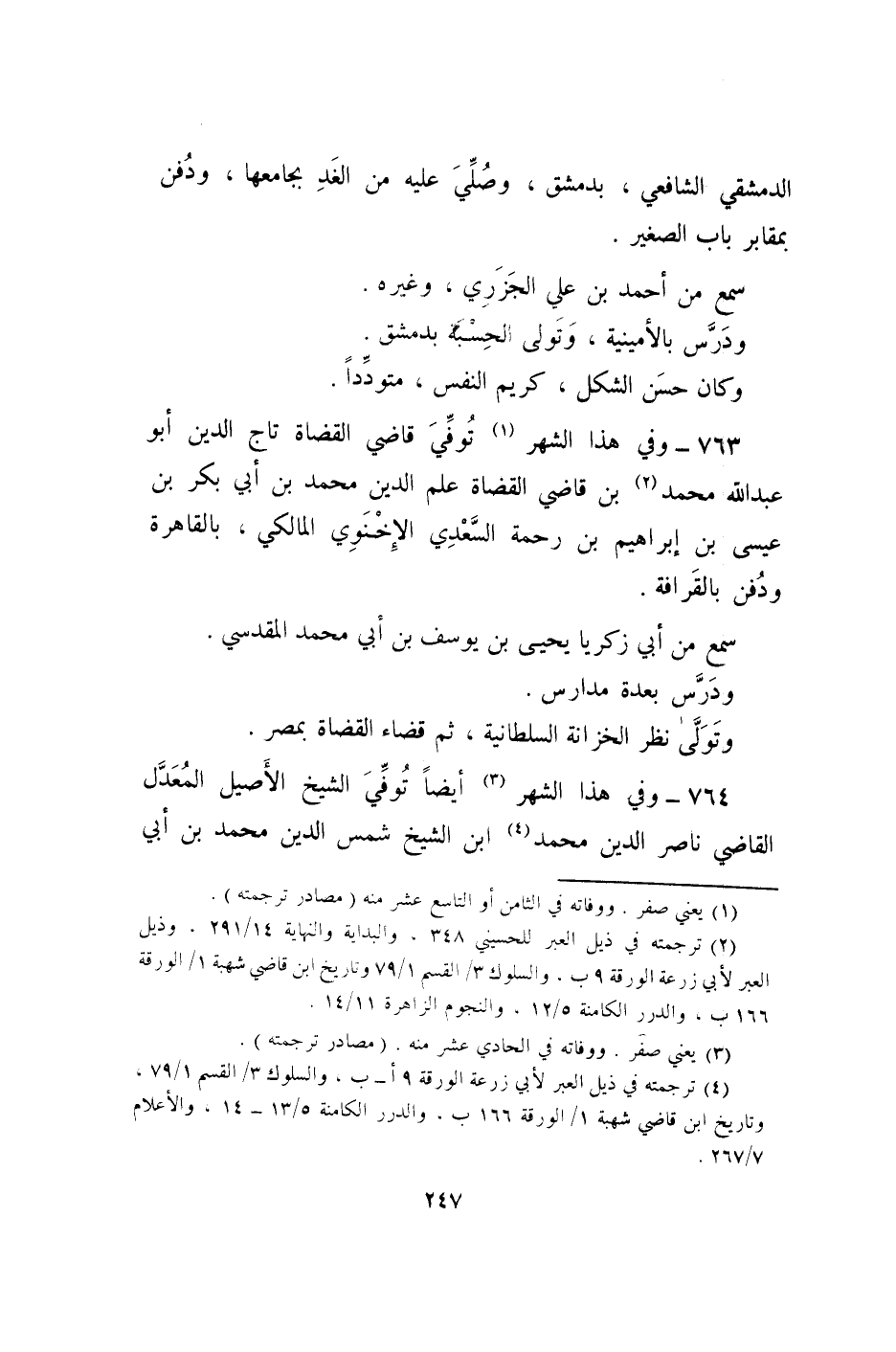 764 - وَفِي هَذَا الشَّهْر أَيْضا توفّي الشَّيْخ الْأَصِيل الْمعدل القَاضِي نَاصِر الدّين مُحَمَّد ابْن الشَّيْخ شمس الدّين مُحَمَّد بن أبي