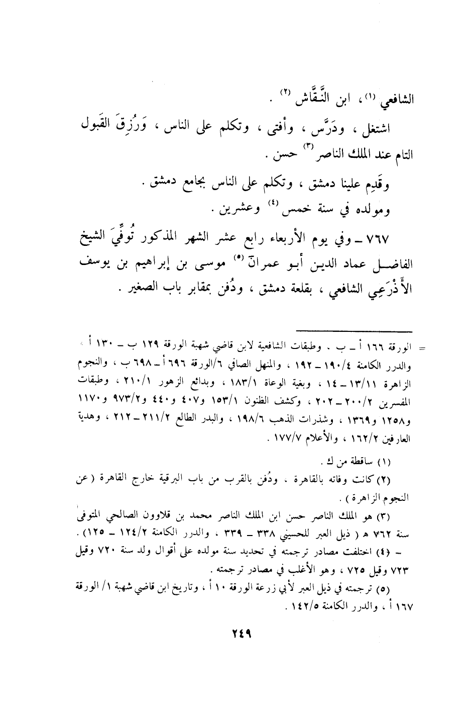 767 - وَفِي يَوْم الْأَرْبَعَاء رَابِع عشر الشَّهْر الْمَذْكُور توفّي الشَّيْخ الْفَاضِل عماد الدّين أَبُو عمرَان مُوسَى بن إِبْرَاهِيم بن يُوسُف الْأَذْرَعِيّ الشَّافِعِي بقلعة دمشق وَدفن بمقابر بَاب الصَّغِير