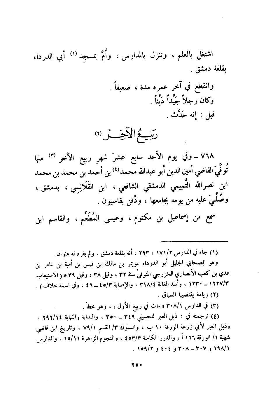 768 - وَفِي يَوْم الْأَحَد سَابِع عشر شهر ربيع الآخر مِنْهَا توفّي القَاضِي أَمِين الدّين أَبُو عبد الله مُحَمَّد بن أَحْمد بن مُحَمَّد بن مُحَمَّد بن نصر الله التَّمِيمِي الدِّمَشْقِي الشَّافِعِي ابْن القلانسي بِدِمَشْق وَصلي عَلَيْهِ من يَوْمه بجامعها وَدفن بقاسيون