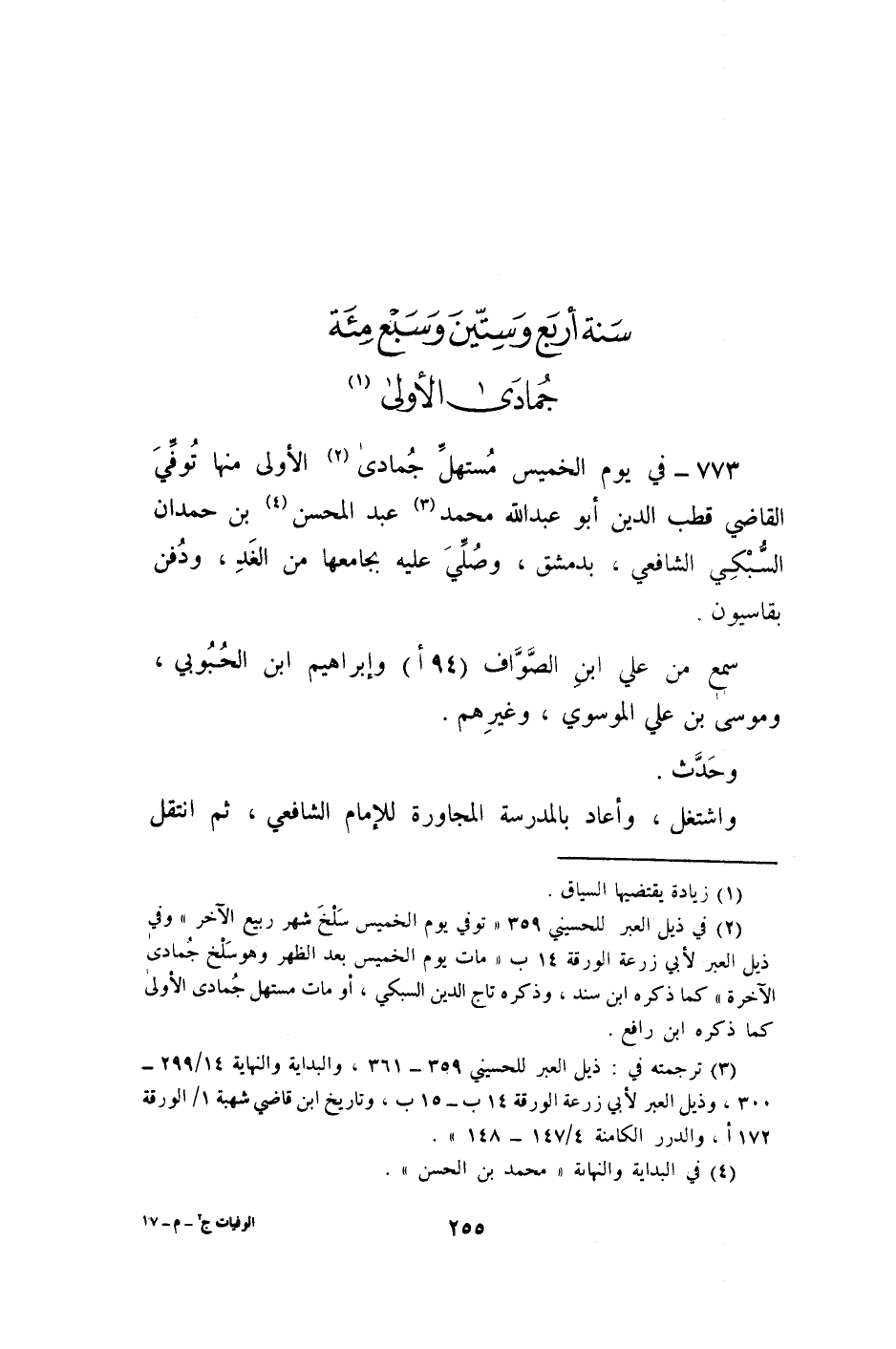 773 - فِي يَوْم الْخَمِيس مستهل جُمَادَى الأولى مِنْهَا توفّي القَاضِي قطب الدّين أَبُو عبد الله مُحَمَّد عبد المحسن بن حمدَان السُّبْكِيّ الشَّافِعِي بِدِمَشْق وَصلي عَلَيْهِ بجامعها من الْغَد وَدفن بقاسيون
