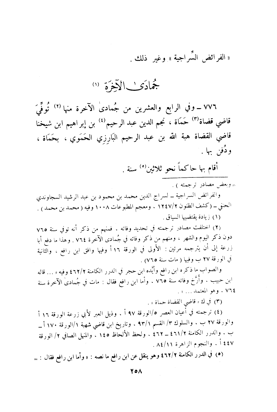 776 - وَفِي الرَّابِع وَالْعِشْرين من جُمَادَى الْآخِرَة مِنْهَا توفّي قَاضِي الْقُضَاة حماة نجم الدّين عبد الرَّحِيم بن إِبْرَاهِيم ابْن شَيخنَا قَاضِي الْقُضَاة هبة الله بن عبد الرَّحِيم الْبَارِزِيّ الْحَمَوِيّ بحماة وَدفن بهَا