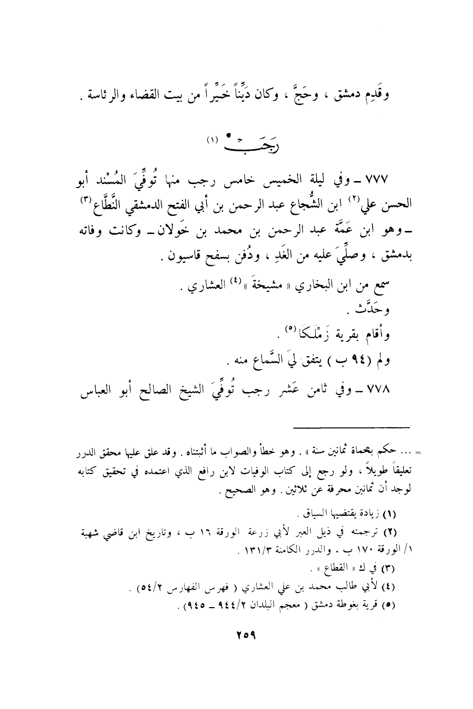 777 - وَفِي لَيْلَة الْخَمِيس خَامِس رَجَب مِنْهَا توفّي الْمسند أَبُو الْحسن عَليّ ابْن الشجاع عبد الرَّحْمَن بن ابي الْفَتْح الدِّمَشْقِي النطاع وَهُوَ ابْن عَمه عبد الرَّحْمَن بن مُحَمَّد بن خولان وَكَانَت وَفَاته بِدِمَشْق وَصلي عَلَيْهِ من الْغَد وَدفن بسفح قاسيون
