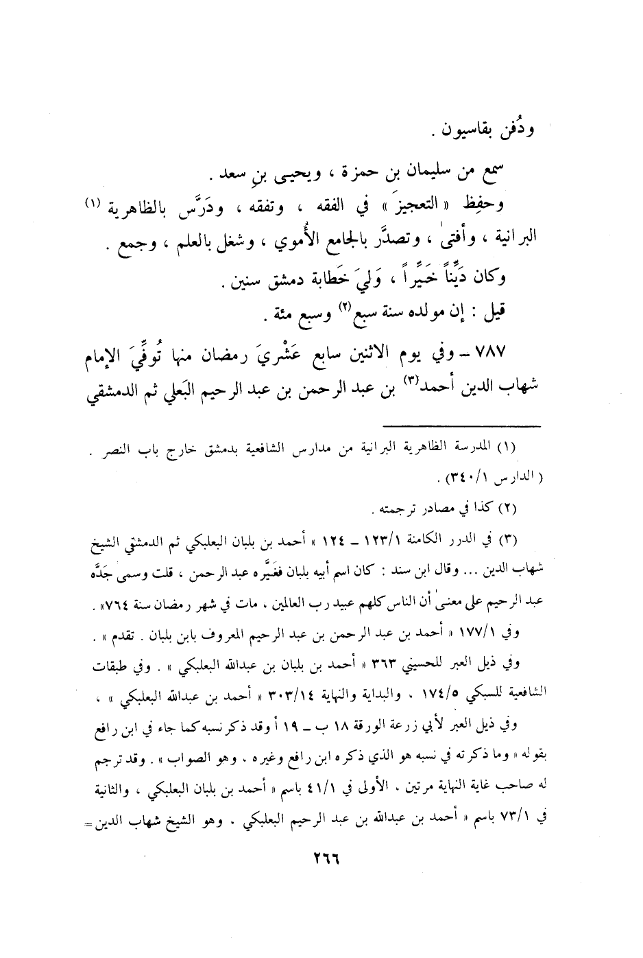 787 - وَفِي يَوْم الِاثْنَيْنِ سَابِع عشري رَمَضَان مِنْهَا توفّي الإِمَام شهَاب الدّين أَحْمد بن عبد الرَّحْمَن بن عبد الرَّحِيم البعلي ثمَّ الدِّمَشْقِي