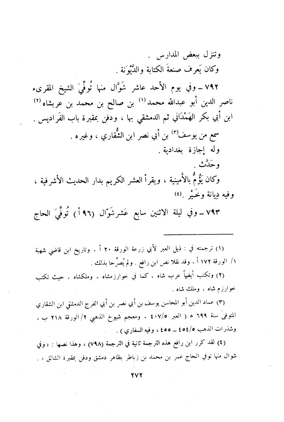 793 - وَفِي لَيْلَة الِاثْنَيْنِ سَابِع عشر شَوَّال (96 أ) توفّي الْحَاج عمر بن مُحَمَّد بن أبي بكر بِظَاهِر دمشق وَدفن بمقبرة الشالق