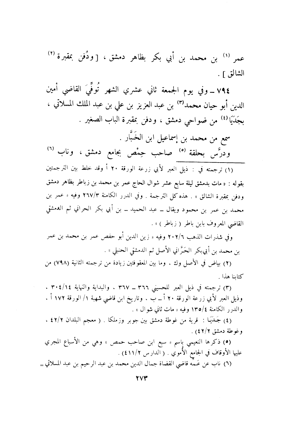 794 - وَفِي يَوْم االجمعة ثَانِي عشري الشَّهْر توفّي القَاضِي أَمِين الدّين أَبُو حَيَّان مُحَمَّد بن عبد الْعَزِيز بن عَليّ بن عبد الْملك المسلاتي بجديا من ضواحي دمشق وَدفن بمقبرة الْبَاب الصَّغِير