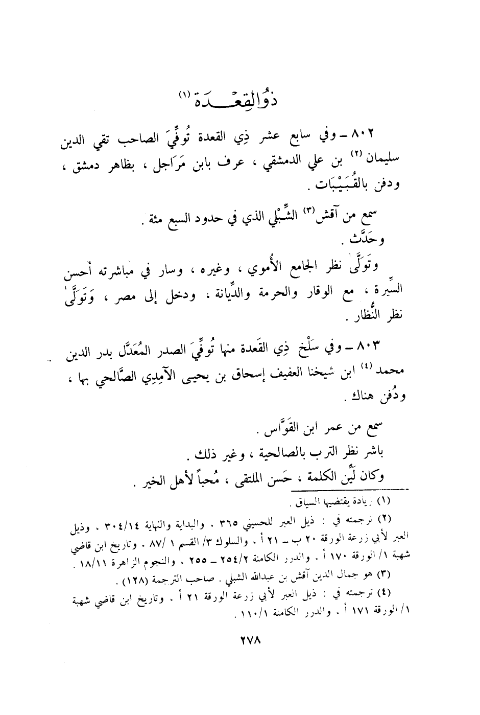 802 - وَفِي سَابِع عشر من ذِي الْقعدَة توفّي الصاحب تَقِيّ الدّين سُلَيْمَان بن عَليّ الدِّمَشْقِي عرف بِابْن مراجل بِظَاهِر دمشق وَدفن بالقبيبات