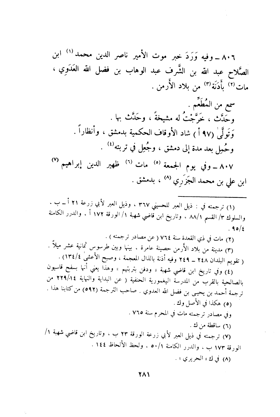 806 - وَفِيه ورد خبر موت الْأَمِير نَاصِر الدّين مُحَمَّد ابْن الصّلاح عبد الله بن الشّرف عبد الْوَهَّاب بن فضل الله الْعَدوي مَاتَ بأدنة من بِلَاد الأرمن