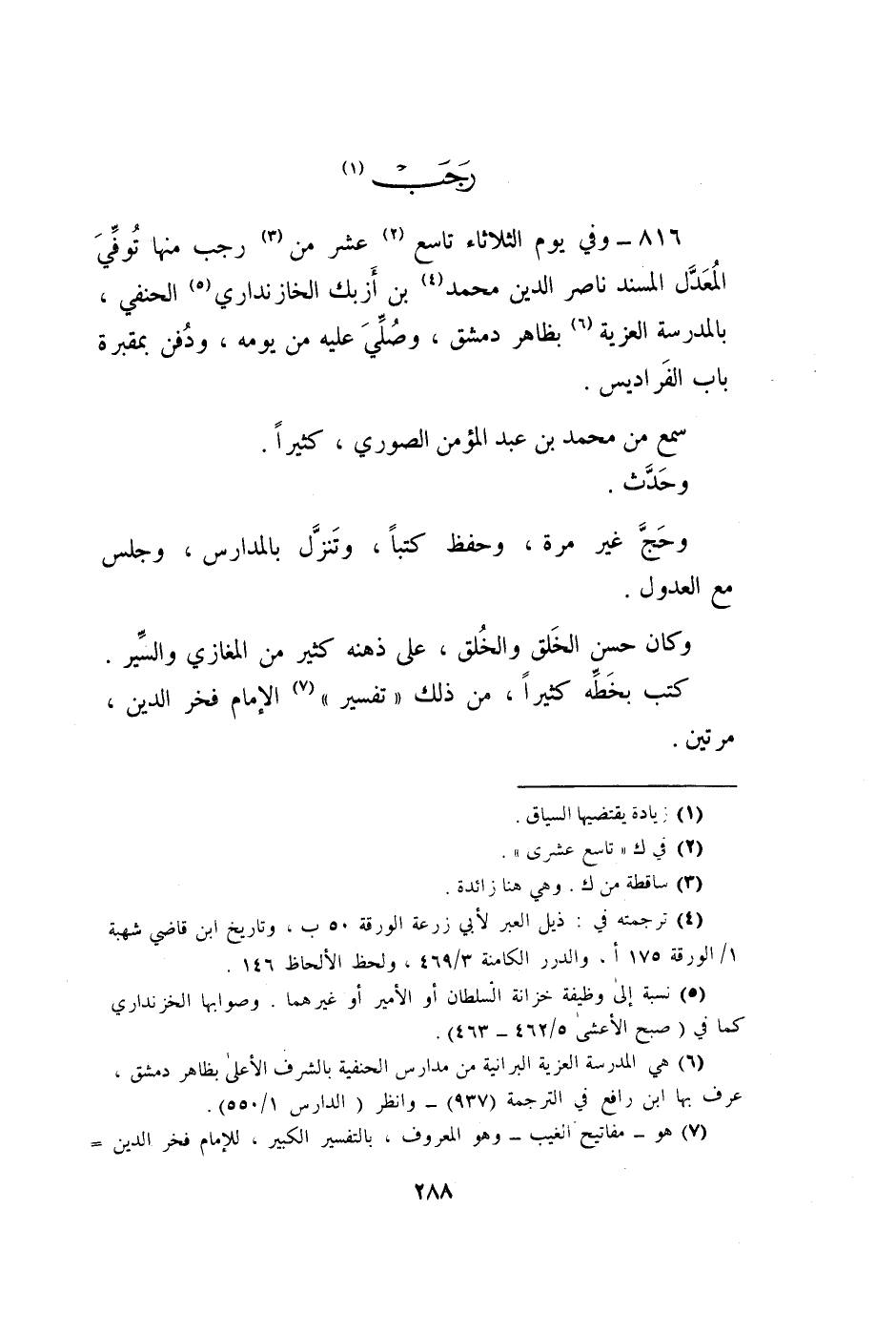 816 - وَفِي يَوْم الثُّلَاثَاء تَاسِع عشر من رَجَب مِنْهَا توفّي الْمعدل الْمسند نَاصِر الدّين مُحَمَّد بن أزبك الخازنداري الْحَنَفِيّ بِالْمَدْرَسَةِ العزية بِظَاهِر دمشق وَصلي عَلَيْهِ من يَوْمه وَدفن بمقبرة بَاب الفراديس