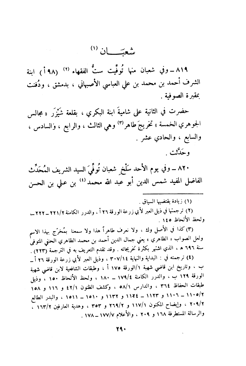 819 - وَفِي شعْبَان مِنْهَا توفيت سِتّ الْفُقَهَاء (98 أ) ابْنة الشّرف أَحْمد بن مُحَمَّد بن عَليّ العباسي الْأَصْبَهَانِيّ بِدِمَشْق ودفنت بمقبرة الصُّوفِيَّة
